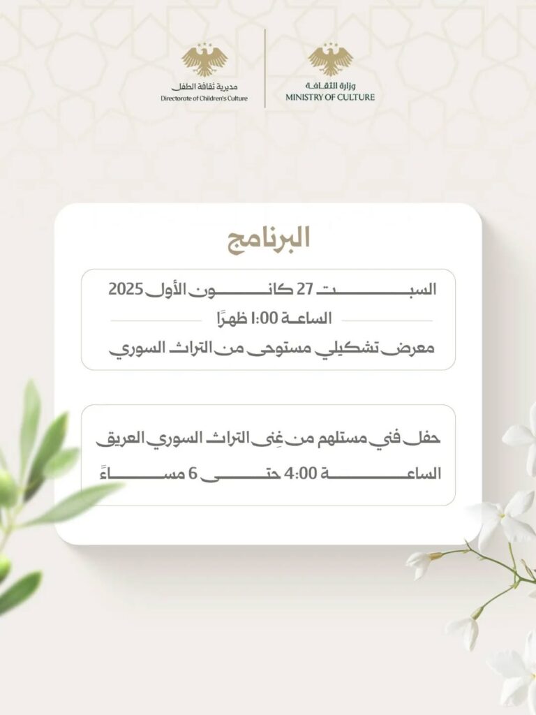 تقيم وزارة الثقافة ممثلة بمديرية ثقافة الطفل، فعالية “التقاء الياسمين بالزيتون”