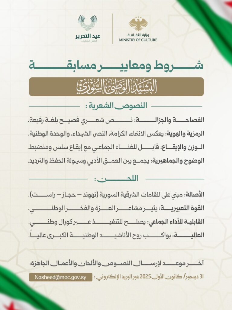 تزامنا مع أعياد التحرير، وزارة الثقافة تطلق مسابقة خاصة لكتابة النشيد الوطني وتلحينه